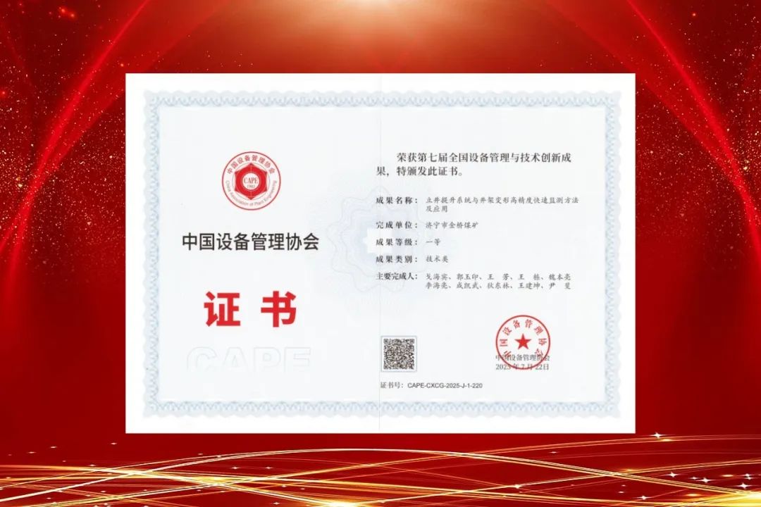 近日,中国设备管理协会组织开展了第七届全国设备管理与技术创新成果评选活动,金桥煤矿申报的“立井提升系统与井架变形高精度快速监测方法及应用”项目荣获一等奖,标志着矿井在智能化安全监测领域取得重大突破