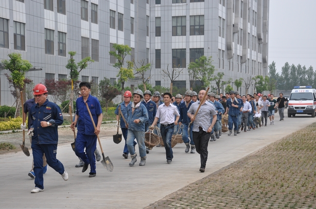 汛期即将临近,为检验雨季“三防”各项工作准备情况,根据矿建工作实际,安居煤矿组织了应急演练活动。下午15:30分,模拟气象台发出橙色预警,预报雨势将由大雨转为暴雨,降雨量可能迅速达到并超过50毫米,矿井工业广场井口及其它地势较低的区域有可能出现被淹没的危险。调度指挥中心接到灾情预报后,立即拉响防汛警报,启动应急预案,同时向井下各施工迎头下达停产撤人命令。各专业小组成员、抢险队员听到警报后迅速响应,各组防汛抢险队员携带抢险工具、物资、车辆设备在副井口附近集结。 15:40分,防汛指挥部成立,抢险救灾总指挥殷然向各组下达抢险命令,分派任务随即开始抢险。主井井口抢险队、副井井口抢险队、机电抢险队、排洪疏通保障队、物资保障对、后勤保障队等各专业队在领到命令后,迅速向各自抢险地点飞奔。15分钟后,主井口、副井口、35KV变电所等重要场所很快建起一道牢固的防洪墙。15:50分,副井最后一罐76人全部安全升井。16:00时,险情解除,抢险成功。