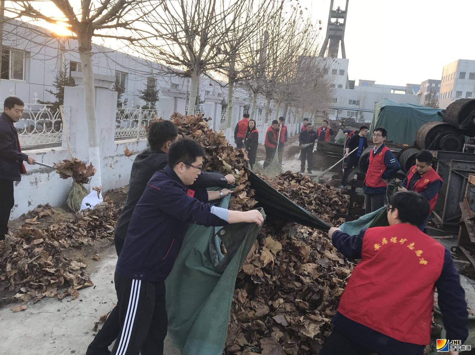 随着温度不断下降,纷纷扬扬的落叶随风飘散,然而,大量落叶的囤积,不仅影响地面标准化建设,而且在干燥气候条件下,极易造成火灾隐患。为消除潜在安全隐患,保障矿区干净、整洁,此次志愿者活动涵盖了机修厂南墙沿线、其他工作区域落叶、杂物清扫、收集、清运等活动内容。下午3时20分,大家在行政办公楼一楼大厅集合,志愿者们身穿志愿者红马甲,扛着志愿者旗帜,奔赴活动地点井然有序地开展活动。虽然天气寒冷,室外温度低至零下,但是依然挡不住志愿者们的热情。在安排了活动注意事项后,大家有的手握铁锨,有的手握大扫帚、有的手持编织袋,或挥动大扫帚、或挥动铁锨清理落叶,或仔细捡拾杂物装袋,或三三两两利用大帆布整理垃圾,或三三两两往车皮内倾倒落叶……